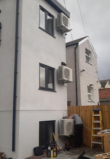 Mitsubishi Electric multi-split air conditioning systems installed to heat and cool the new flats. Flats 1, 2 & 3 have 3 indoor units connected to the one outdoor unit. Flat 4 has 2 indoor units connected to one outdoor unit. The Mitsubishi Electric multi-split systems will keep the energy bills as low as possible as they are A++ energy rated, air conditioning is the most cost effective way to heat and cool a property.